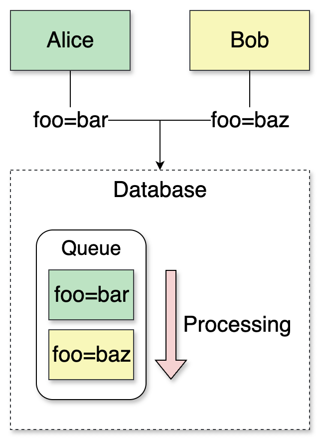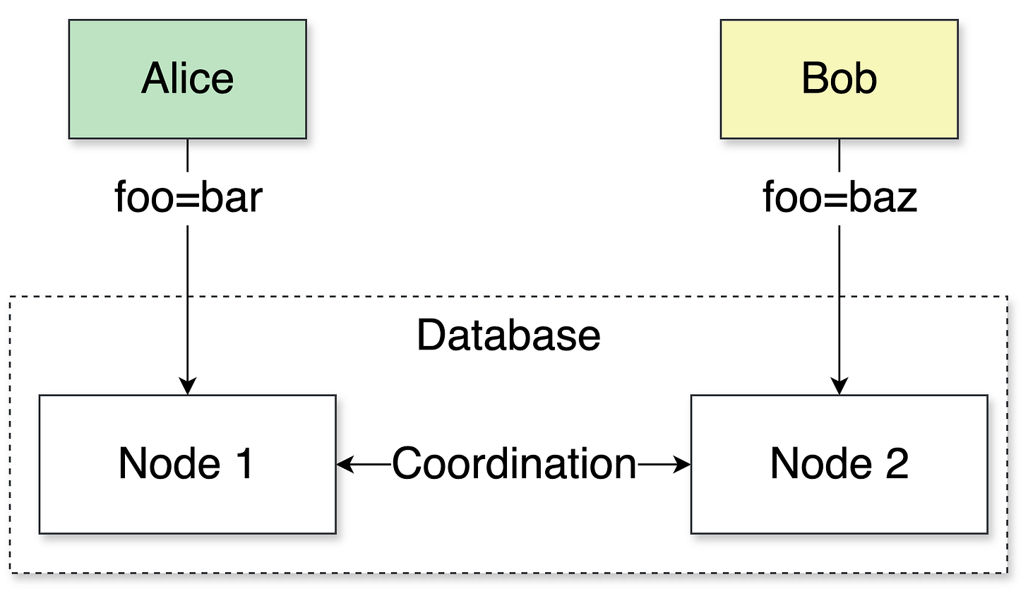 Suppose two clients, Alice and Bob, update the same key around the same time. A simple policy to resolve conflicts is latest wins. The database can serialize operations for the same key to ensure the latest request wins: