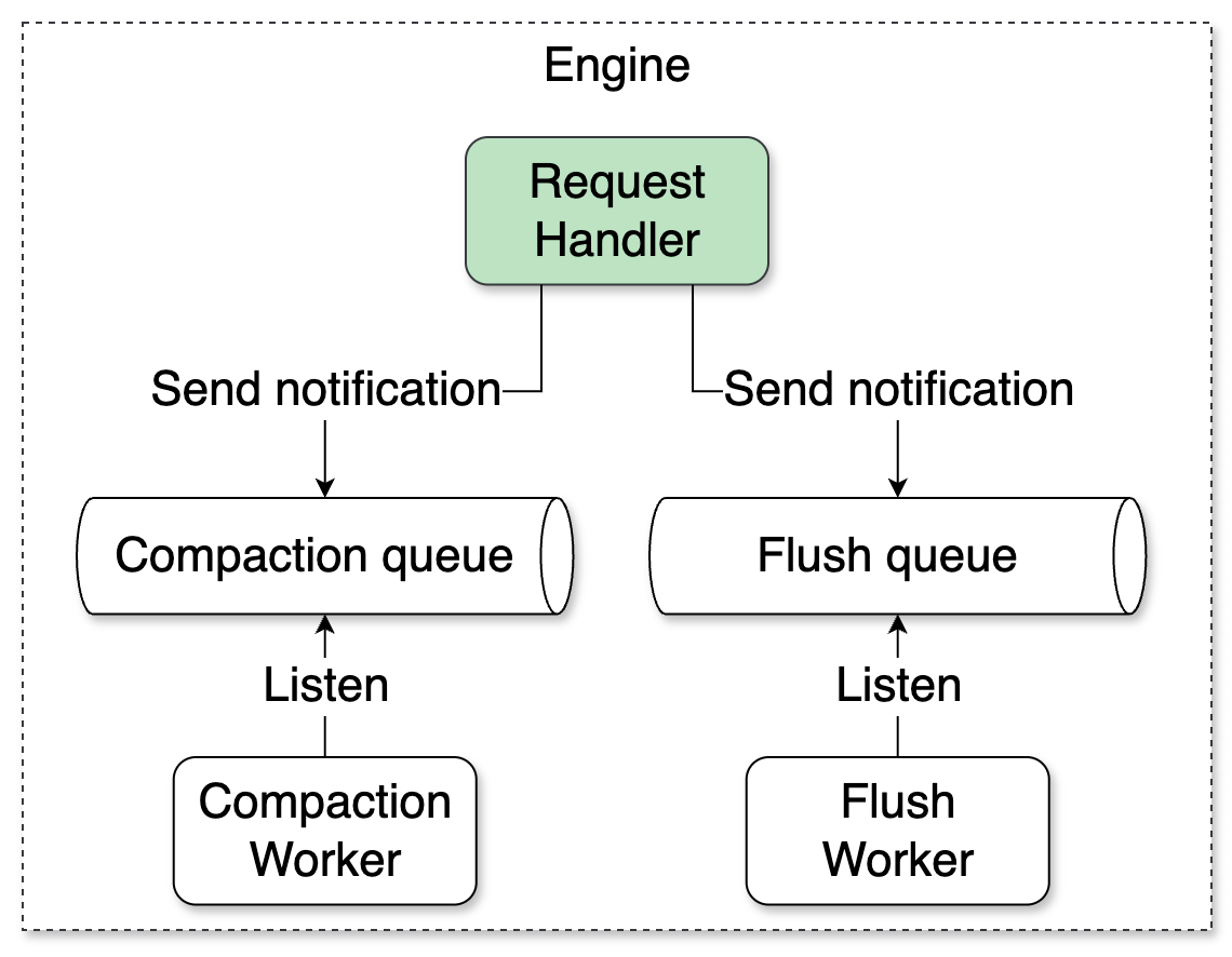In a nutshell, flush and compaction will move to the background. You’ll use internal queues plus worker pools to ensure no overlapping work on the same resources: at most one flush running at a time, and at most one compaction running at a time.