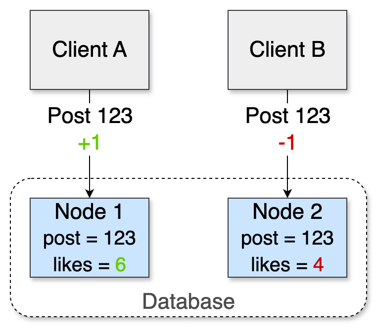 Imagine a database with two nodes tracking the number of likes on a post. Node 1 receives a new like, increments its counter, and replies success to the client: