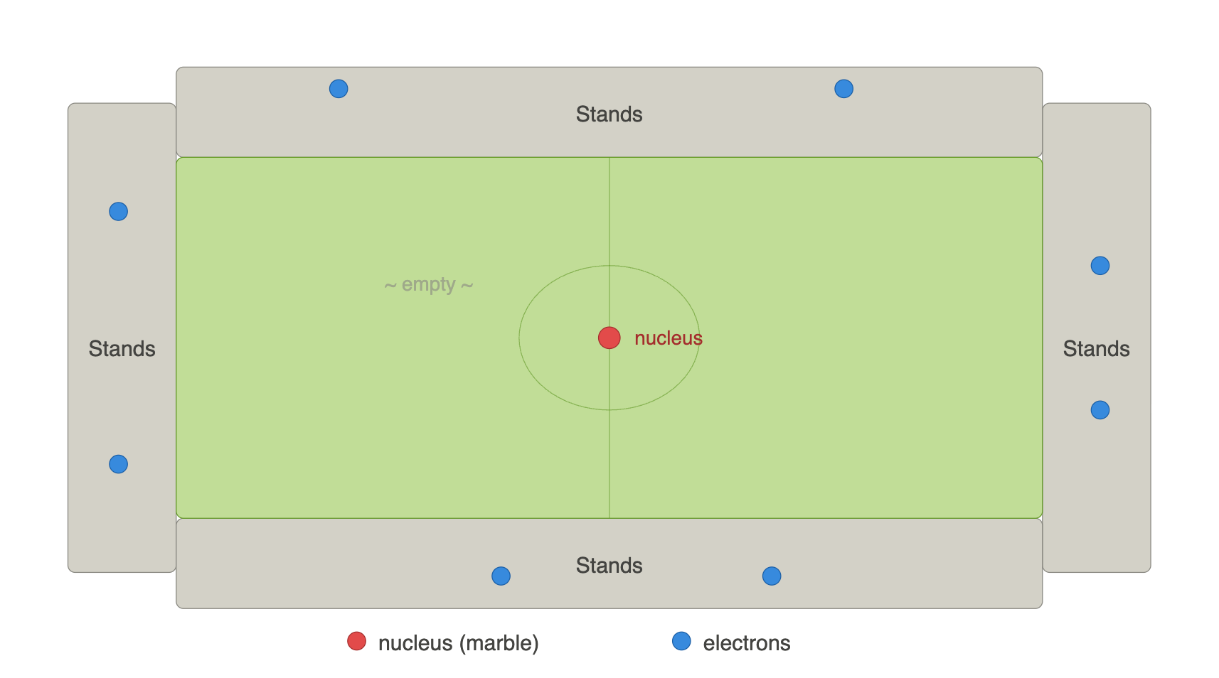 One might think that when touching a solid object, like a table, for instance, what gives the table its solidity is that it is “filled” with matter, preventing our finger from passing through. Yet, if we took the nucleus and enlarged it into a marble and placed that marble on a football pitch, the electrons would be orbiting at the level of the stands.